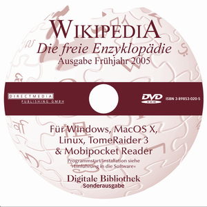 Sono disponibili anche CD e DVD di Wikipedia. Il progetto tedesco di Wikipedia è stato il primo a rilasciarne una versione su questi supporti nel 2004; attualmente sono arrivati alla seconda edizione.